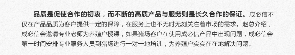 江西成必信生物科技有限公司(下文简称“成必信”)是赵总代理的厂家之一,一直专注于猪群免疫抑制及亚健康调理,旗下的猪护士、保加勉、仔多健等高端产品得到了众多猪场客户的高度认可。由于成必信的产品真正能为养殖户创造价值所以赵总所服务的客户群体中,成必信高端调理品的使用率一直持续上升。